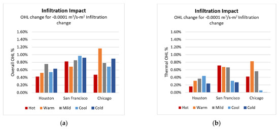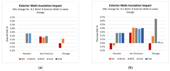 Impact of a 0.1 W/m2-K decrease in exterior wall U-value on overall (a) and thermal (b) OHL.