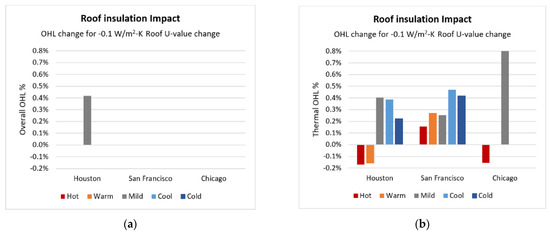Impact of a 0.1 W/m2-K decrease in roof insulation U-value on overall (a) and thermal (b) OHL.