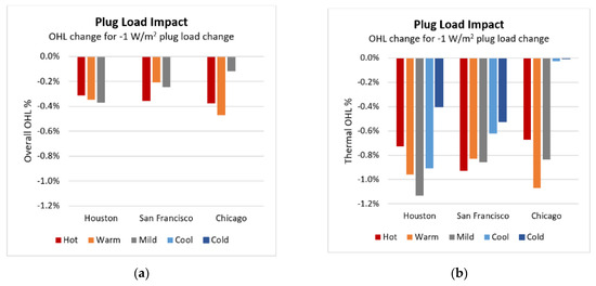 Impact of a 1 W/sq.m decrease in plug loads on overall (a) and thermal (b) OHL.