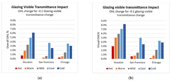 Impact of a 0.1 decrease in glazing visible transmittance on overall (a) and visual (b) OHL.