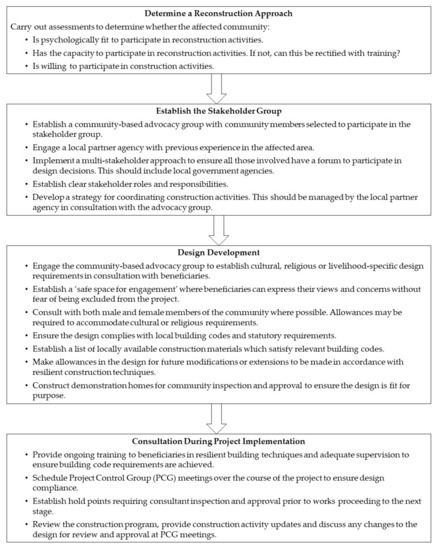 Mulligan and Nadarajah [9] discuss the benefits of establishing a community-based advocacy group as a means of ensuring community requirements are clearly defined and communicated to the implementing agency through a single point of contact. It also provides an opportunity for community members to contribute to the decisions made regarding the equitable distribution of financial aid, reducing the risk of political interference on the basis of ethnicity or religious beliefs. However, Ahmed [8] describes how the quality of information gathered during the consultation process may come into question as participation levels are often low where communities are still dealing with the impact of a disaster including displacement and the loss of family members. This issue is often exacerbated where prominent members of the community lose their lives as a result of the disaster, leaving communities without the leadership required to mobilize and contribute to the consultation process [25]. In some cases, communities feel over-consulted and become frustrated with a process they find to be excessively time-consuming when their priority is the need for immediate housing [25]. This may also be the case where beneficiaries presented with the opportunity to collaborate on housing design are reluctant to request changes or provide negative feedback for fear of being refused a house. This often leads to future, less resilient modifications being added, leaving beneficiaries vulnerable to future hazards [9,32].