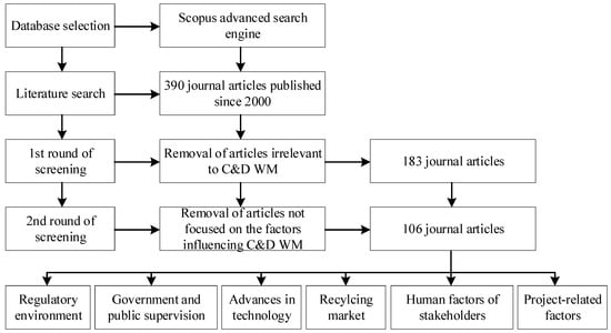 Two rounds of screening were undertaken in this study to identify the most relevant literatures for further analysis. In the first round of screening, the articles closely relating to C&D WM practice were retained. Those relating to material science and technology development using C&D waste were seen irrelevant to management practice and thus removed. The first round of screening resulted in 183 articles. In the second round screening, the titles, keywords, and abstracts of the 183 articles were carefully checked. For articles to be retained, the article had to report either the general factors influencing C&D WM, or the factors positively (i.e., drivers) or negatively (i.e., barriers) influencing C&D WM. The articles not focused on the factors influencing C&D WM were excluded. Finally, 106 articles were retained for further analysis.