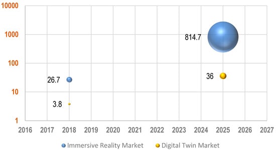 Figure 1 shows the increase in demand for immersive technologies and DT in two separate years. The figure shows that there might be a large market for virtual reality or augmented reality tools. While the market for immersive technologies is growing, DT demand has increased from $US3.8 billion to $US36 billion. DT can exploit and articulate the unique capabilities of augmented reality and the IoT device for any user [].