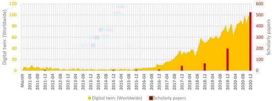 In order to present the quantitative features of digital twin scientific research and offer an insight into the scholarly publications, this section provides a set of analyses. The literature suggests the use of scientometric analysis to identify emerging trends, as well as evaluating relevant literature. This method is deployed to map scientific knowledge in the selected field and assists scholars to identify the field’s challenges or needs. There are examples of extensive quantity analysis in smart home []; lean construction []; Internet of Things (IoT) []; construction delay []; Information and Communication Technology (ICT)-assisted disaster management []; and additive manufacturing []. Figure 2 offers a trend analysis of Google search for DT and its application (see the yellow area). The number of scholarly papers published on DT in Scopus also shows that academia and practitioner attention has risen, with a large increase in the number of scholarly papers indexed in Scopus and Google search in recent years (1536 in 2020).