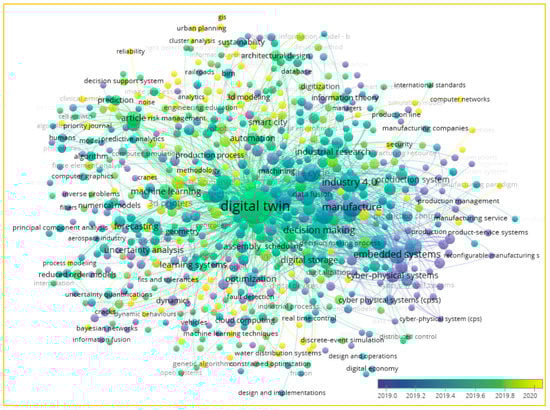 Figure 3 shows the co-occurrence of keywords used in the DT literature based on Scopus search data. The keyword ‘Digital Twin’ was used to search within the title, abstract and keyword fields. Search results were refined by applying the year limitation (2011–2020) and by selecting only the journal articles that were published in English. The analysis is based on a minimum of 635 words out of 6877 from the data set of 817 journal papers published in the past decade.