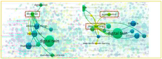 Figure 4 shows themes that have emerged alongside DT in recent years, such as blockchain and deep learning. It also shows that one of the earliest applications of DT was in manufacturing.