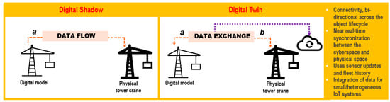 Very few papers referred to digital models (e.g., BIM) and DT as similar concepts or used them interchangeably [,,]. However, there is a significant difference between DT and current digital 3D models and 3D systems. If a virtual model represents the physical model only, with one-way data flow, this is considered to be a Digital Shadow (DS) []. Figure 6 shows the one-way data flow from a digital model to a physical entity of a tower crane in a DS. However, in a DT, both the virtual and physical entities should communicate with each other. A decade ago, an early definition of DT was considered to be an integration of the multi-physics of a vehicle with probabilistic simulation that mirrored its life []. Later in the literature, the vehicle was replaced with a machine, factory, processes, labour, and many other physical entities [], and the replication of this concept in many other disciplines is growing.