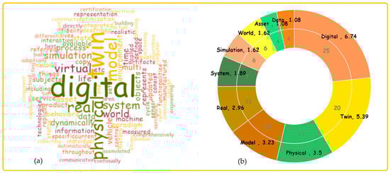 The analysis of 21 key definitions of DT published between 2012 and 2019. (a) Visualisation of the word frequency; (b) the count value for high-frequency words and the weighted percentage among all the stemmed words used in definitions.