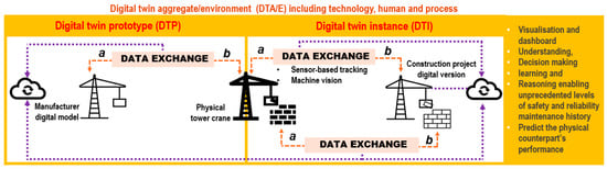 Figure 6 shows the bi-directional data flow between digital model and tower crane in a proposed DT. Digital Twin (DT) emphasises bi-directional conversations [,,], and data flow is automated []. This means that every digital representative of a physical object cannot be considered to be a DT [].