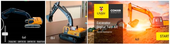 Digital and physical objectives in outdoor experimentation. (a) augmented model; (b) physical excavator model; (c) the DT application entrance.
