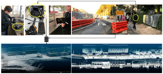 The possibility of using diverse wearable sensors, smartphones, tablets, and other intelligent sensors may accelerate the acceptance of DT in different contexts. The diversity of these devices may present challenges of data granularity, interoperability, the heterogeneity of information, multi-source information, and many attributes such as data format, data sampling intervals, data security, and trust. These will need to be resolved to increase industry readiness for utilising the DT. For example, the most common source of data is images or videos, and recently handheld mobile scanners are widely available to collect point cloud datasets. However, collecting point cloud data frequently from the built environment and construction sites can be expensive. Previous studies have examined different tools for point cloud data acquisition and suggested that handheld tools are more convenient and efficient, depending on the accuracy required [,,,,]. Figure 11 shows how both images and point clouds are collected from outdoor areas of a light rail construction project. A handheld tool was used for data acquisition, and Sepasgozar, Forsythe and Shirowzhan [] discussed the advantages of the handheld scanner in comparative experimentation. Using handheld mobile scanners helps practitioners to collect data easily and more quickly than using terrestrial scanners. Providing a comprehensive image of the built environment can be possible if a multi-modal data acquisition method is adopted, although it can be technically challenging. This approach was used in other disciplines, such as modern automobiles [].