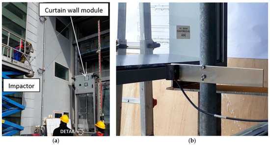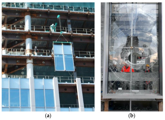 Example of curtain wall: (a) modular unit and (b) failure under impact.