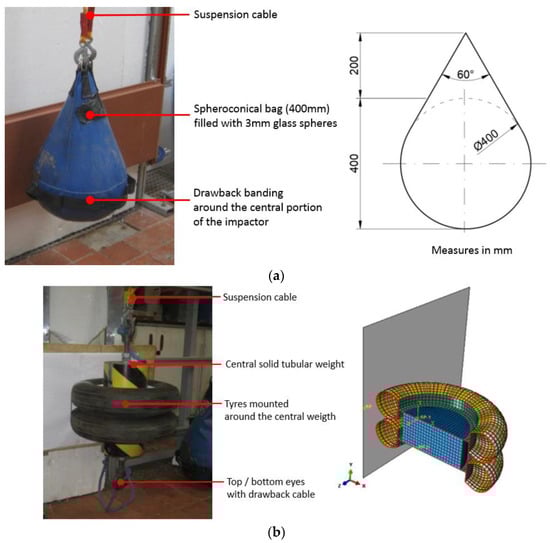 For a long time, the SBI performance has been assessed through experiments, based on standardized testing procedures. Usually, these tests are carried out in-situ, or in laboratory conditions on full-scale mock-ups. The mostly used impactors, see Figure 2, are the spheroconical bag (SB) and the twin tire (TT). The former is filled with glass spheres and has a total weight M = 50 kg, while the latter consists of two pneumatic tires inflated with 3.5 bar air pressure. A steel mass (M = 50 kg) is included within the tires themselves. In this research paper, the tires consisted of Vredestein V47 pneumatics [22].