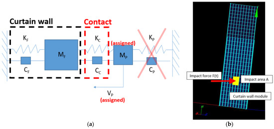 Depending on the type of impactor in use (see Figure 6) the input parameters must be then properly specified to account for the TT or SB effects (STEP 4), as well as the effect that they transfer to the facade (STEP 5). Given that MP and vP are known, in accordance with the 2-DOF model in Figure 5a, such parameters are described in the form of a simple mechanical law for the contact itself (i.e., KP and CP are set to 0). The contact parameters KC and CC that are required for STEP 5, in other words, are responsible of the actual force (and time history features) that the impactor can transfer to the curtain wall, depending on the time of contact and on the impactor features. In this research study, all these parameters were iteratively calibrated, based on experimental results and numerical fitting (Section 6.2). Once the above parameters are known, the result of the 2-DOF model is a scaled impact force that implicitly accounts for the reduced impulse IR in Equation (6), and can be thus assigned to the FE model, to perform non-linear dynamic analyses of the system (STEP 6).