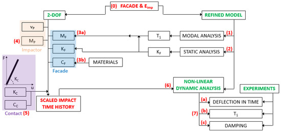 For a given glass curtain wall under SBI, a coupled approach based on a simplified 2-DOF model and a more accurate numerical model (Code Aster) is considered for the modular unit in Figure 5. For the 2-DOF model in Figure 5a, more in detail, components with subscript “F” refer to the facade systems, while the subscripts “P” and “C” are used for the impactor and the contact parameters. The design procedure herein proposed is achieved (and generalized) through the sequence of steps that are schematized in Figure 6. In the STEP 0, the features of the curtain wall and the desired impact energy Eimp are defined for the loading condition of interest. Given that MP = 50 kg, the corresponding impact velocity vP and the related ideal impulse Iid are first derived from Equations (3) and (4). At this stage, both the 2-DOF and the FE models of Figure 5 must be properly characterized.