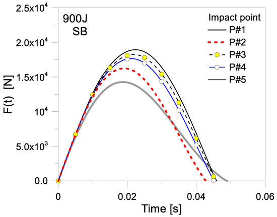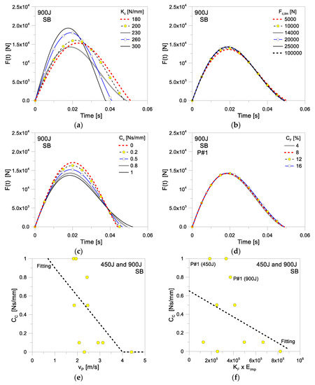 However, the most influencing parameter for the SB description was represented by the elastic stiffness KC. Accordingly, the iterative calculations were carried out by setting, in the order, KC (with CC = 0), thus FC,limit (with CC = 0, and KC fix) and then CC (with fix KC and FC,limit values). The latter, being susceptible to various parameters on the side of the impacting bodies but also on the impact energy, was calculated in a variable magnitude, as a function of Eimp and KF. In any case, its final value for the SB impactor was usually optimized in the range of ≈0.1–1 Ns/mm, with limited variations for the overall experimental program.