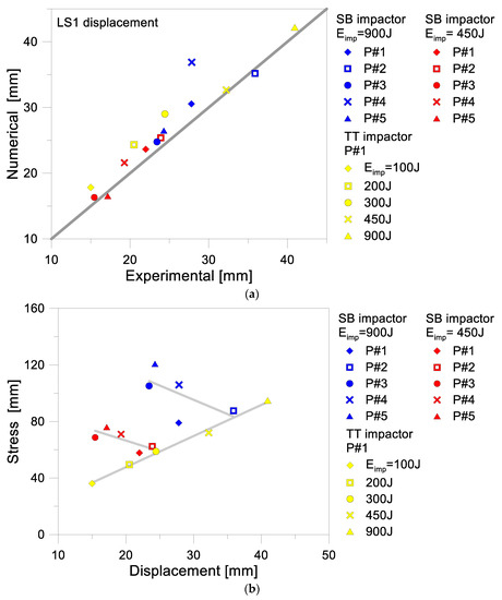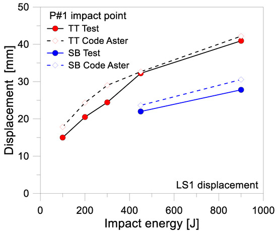 The overall calibration process was based on the minimization of the percentage scatter of the deflection peaks from the FE model and the corresponding experimental records (LS1), under the 15 available testing configurations. The same iterative approach was thus separately repeated for the specimens with TT or SB impactor, so as to obtain a univocal simplified characterization of the two types of impactors. In Table 5, the so-calibrated values are proposed.