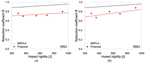 Calculated reduction coefficients R as a function of the impact rigidity, with Eimp equal to (a) 450 J or (b) 900 J.