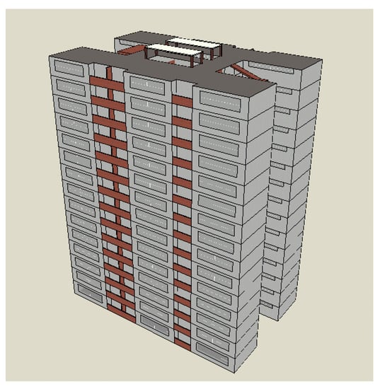 Figure 3 presents the archetype of the category of median income multi-family buildings made using DesignBuilder. The estimation error of energy consumption, , is calculated by Equation (6), where is the density of estimated annual energy consumption by the archetype (kWh/m2·year) and is the density of average measured values of annual energy consumption of the buildings represented by archetype (kWh/m2·year), which is calculated by Equation (7), where is the density of the measured energy consumption of the building (kWh/m2·year). The energy model of the archetype is satisfactory when is lower than 10%.