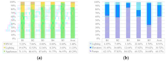Figure 4 shows the distribution of the energy consumption of each building. For housing units, electrical equipment (appliances and other electrical loads) uses the most amount of energy, between 71.11% and 96.97%, being greater than 87.6% for building without air conditioning units. The consumption by lighting is on average 11.23%, varying between 3.03% and 19.67%. The intense use of LED lamps of 12 W explains mostly the low consumption by lighting in B5.