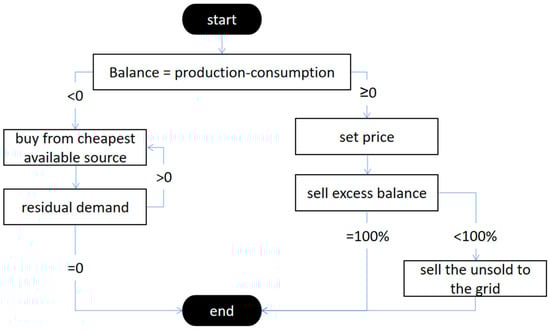 - Every agent has an energy balance in each HOY (Hour of the Year). The energy balance is determined by its PV power (if it owns a PV system) minus its power demand in that particular HOY. If the balance is negative, the agent will be a net buyer in that HOY, otherwise it will be a seller. This rule implies that each agent can only sell electric power if it has already satisfied its own demand. Simply, each household can sell only excess PV production.