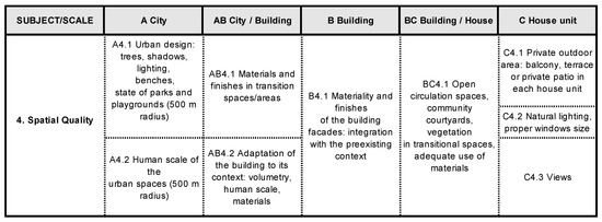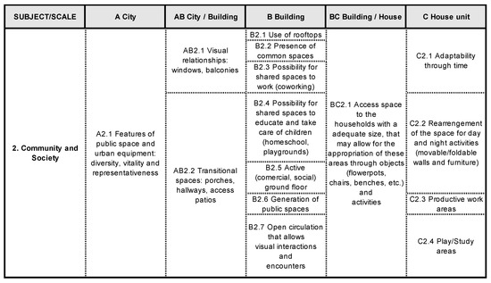 Category 2: the “Community and Society” indicators, shown in Figure 2, are related to those spatial characteristics that allow appropriation by the inhabitants. They become especially relevant in the intermediate scales AB City/Building and BC Building/House, since it is where encounters take place, where the two spheres of the public and the private meet, generating “colugares” [47], border spaces where the common is built.