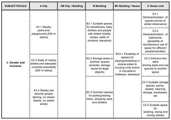 Category 3: The Gender and Inclusion indicators bring together all those parameters that have to do with inclusion and gender, from the security and accessibility of public space, the presence of facilities that allow the development of daily life in the vicinity of the home, to the presence in the building and in the home of spaces that favor the development of care tasks, as shown in Figure 3.