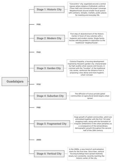 If we think of a simplified evolution of the inhabited space in Guadalajara, from a chronological point of view, we can recognize at least six main stages: the historical city, the modern city, the garden city, the suburban city, the fragmented city and the most recent vertical city. Although it is a conceptual reduction, it is useful to understand and catalog the new urban characteristics that arise in each historical moment, which are peculiar to Guadalajara, although they are the reflection of global processes and phenomena that we can clearly recognize in other cities in Latin America and in the rest of the world. For clarity, a summary with the six stages is shown in Figure 5 and each stage is explained with more detail below.