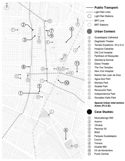 As shown in the map in Figure 7, all the projects are located in downtown Guadalajara, close to important urban spots (A to Q) and to the main long-distance public transport lines, situated either within or close to the historic center special intervention perimeters, where the City Council establishes the applicability of distinctive urban and housing projects, promoting services and mixed use developments, as well as public transport, in order to regenerate the area.