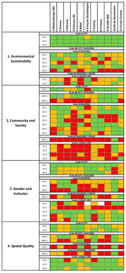 The methodology has been built on the theoretical approach set out above and the “Inhabiting the Present” assessment tools [46]. An analysis matrix has been proposed in order to analyze eleven new housing developments in Guadalajara’s downtown, with indicators divided in four main categories: Environmental Sustainability, Community and Society, Gender and Inclusion, Spatial Quality. These four categories are crossed with five total scales as detailed in the Table 1 below.