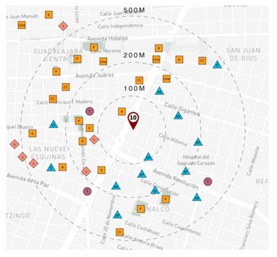 Example of analysis at city scale: urban context nearby study case number 10 “XX de Noviembre”, where triangles indicate places related to reproductive dimension (markets, playgrounds, schools), squares are related to the personal dimension (restaurants, parks) and circles are related to the productive dimensions (offices, enterprises). Source own elaboration.