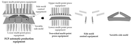 FCP automatic production equipment can automatically produce panels. This equipment consists of two-sided multi-point press equipment, side mold control equipment, and variable side mold, as shown in Figure 1. Two-sided multi-point press equipment consists of upper multi-point press equipment and lower multi-point press equipment. This forms a mold to implement the curved surface of the top and bottom of the panel. Side mold control equipment can produce various shapes of FCPs and can adjust the side angle of the panel. Variable side mold can transform the mold according to the side curvature and shape of the panel.