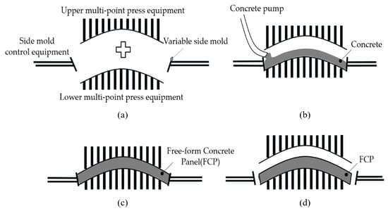 FCP’s manufacturing process can be divided into four categories: combination, injection, curing, and demolding, as shown in Figure 2. First, the upper, lower, and side mold equipment is combined according to the shape of a panel to be manufactured. Then, concrete is injected into the mold. The injected concrete is compressed and cured by the upper multi-point press equipment. Finally, the manufacture is completed by removing the mold of the FCP that has been cured.