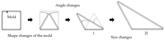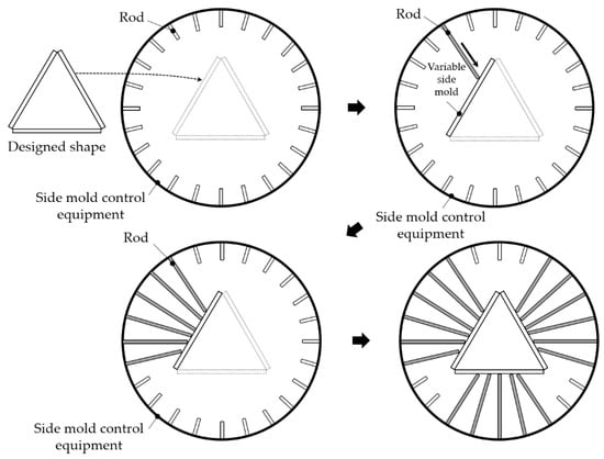 The reuse of molds requires flexible transformation of the mold. For example, a square mold should be able to change into a triangle, as shown in Figure 3. That is, in order to reuse the mold, the side mold control equipment must be able to change the shape of the mold. In addition, this equipment should be capable of transforming the mold to produce various shapes of panels. Even if the panels are all polygons, the panel’s shape may vary depending on the angle. Triangles are divided into regular, acute, and obtuse-angled triangles, depending on the angle they form. They are all triangles, but the panels are not the same since they all have different angles. Therefore, this equipment should be capable of varying the angle of the mold. Furthermore, the panel used for the curved surfaces may vary in size depending on the building or the curved surface position. There may be size changes, even when the shape and angle required by the panel are the same. Therefore, the side mold control equipment should change the shape, angle, and size of the mold to cope with panel diversity.