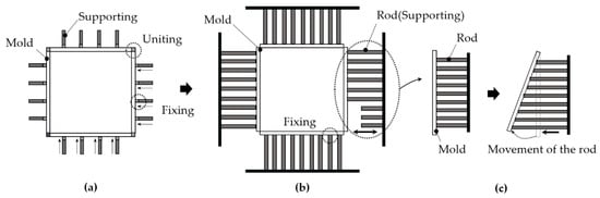 The conventional method forms a mold to fit the shape of the manufacturing panel and unites them together to prevent them from being distorted, fixed by supports. The supports hold the mold so that they do not move. This method does not allow the mold to transform because there is no movement of the rod, so the mold cannot be reused. The movement of the rod is necessary to reuse the mold. Therefore, as shown in Figure 4, the concept of the rod is applied to the side mold control equipment. The rod was applied as a support to hold the mold and changed the mold’s shape by movement of the rod. This can produce various shapes of FCP molds.