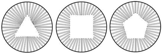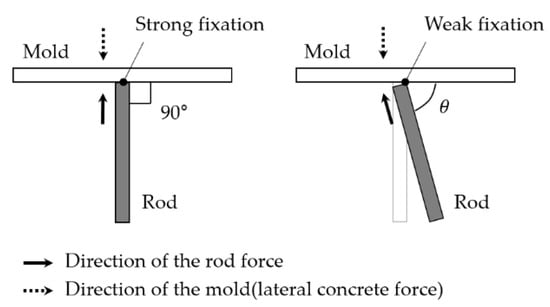 The importance of the rod’s arrangement can also be explained by lateral pressure. The rod should be capable of securing the mold firmly to prevent the mold’s distortion due to the concrete’s lateral pressure. To hold the mold, the direction of the rod and mold (lateral concrete force) must be horizontal. For example, if the FCP is manufactured in a triangle, as shown in Figure 6, the rod must be fixed on three sides of the triangle mold. Multiple rods should be fixed to each mold and at least one rod must be fixed to the mold for strong fixation. Accordingly, the rod was placed in a square, hexagonal, and circle to select the arrangement of the rod.
