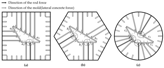 Direction of force between the rod and mold according to arrangement type: (a) Square arrangement; (b) Hexagonal arrangement; (c) Circle arrangement.