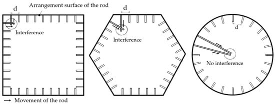 The circle arrangement of the rod causes no interference from the rod. There is interference for each arrangement due to the angle at the arrangement surface formed, as shown in Figure 7. It is possible to check the interference when arranging the rod at the same interval (d) on the arrangement and moving the rod of the part where the arrangement is surface adjacent. Rectangular and hexagonal arrangements result in the interference, even in a small movement or rod due to the angle at which the arrangement surface formed. However, the circular arrangement does not have the arrangement surface angle, and the movement of rod causes no interference. Thus, arranging the rod in a circle is the most suitable arrangement type for side mold control equipment.