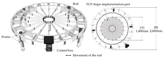 Side mold control equipment consists of rods, a frame, and a control box, as shown in Figure 11. (A) is the FCP shape implementation part, which produces various shapes of the panel through the movement of rods. The diameter of (A) is 1400 mm, and (B), the total size of the equipment, is 2600 mm.