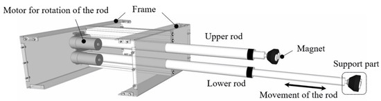 The arrangement of the rod is one of the equipment development’s critical requirements. The rod transforms the mold through movement. The force corresponding to the lateral pressure varies depending on the angle between the rod and mold. This force disturbs strong fixing of the rod and mold. If the angle between the rod and mold are 90°, as shown in Figure 5, the force’s direction is applied horizontally, strongly fixing the mold. However, when the angle gets further from 90°, the force corresponding to the lateral pressure is reduced, meaning it reduces the fixing force of the mold. Therefore, depending on the panel’s shape, the rod needs the proper arrangement so that the mold can be correctly fixed in any position.
