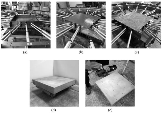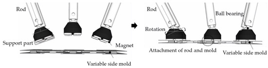 The rods move automatically and implement the shape of the FCP. The circle was divided into 18 sections, a total of 36 rods were arranged, with 18 at the top and 18 at the bottom. It was determined that the number of rods to implement various shapes was appropriate to manufacture the FCP, and two rods were arranged at the top and bottom of each zone. Each rod moves precisely back and forth according to the motor’s number of rotations and up to 500 mm. The rods manufacture a variety of panels through precise movements within the FCP shape implementation. The rod holds the side mold. As shown in Figure 12, the support part of the rod is magnetized, making it easy to attach the side mold. However, depending on the panel’s shape, the rod support and mold is not parallel, thus disturbing strong fixation. For a stronger fixation, a ball bearing was used. As shown in Figure 13, it allows the support part of the rod to rotate. As the rod is arranged in a circle, the frame is made in a circle. The four legs move vertically up to 300 mm. The control box allows the overall operation of the equipment and individual numerical control of the rod. All members of the equipment were firmly fixed. However, since rotation of the internal one and bending of the upper and lower rods may occur when producing large-sized members, the equipment can be strengthened by reinforcing structural cross-bracing elements. Variable side molds are manufactured by attaching steel plates together using bolts and metal spacers.