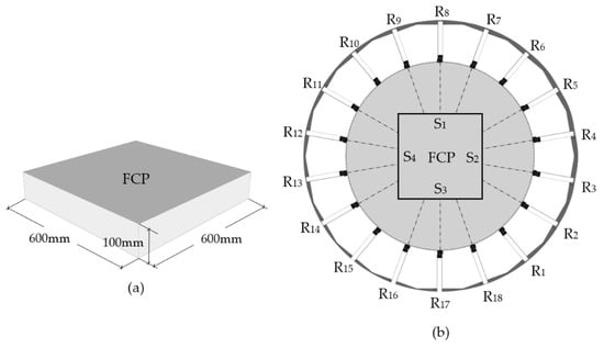 The production range of FCP using the equipment was identified. The largest size of a triangle panel allows the length of one side to be 1212 mm and the smallest size allows the length to be 691 mm. The largest size of a rectangle panel allows the length of one side to be 989 mm and the smallest size allows the length to be 400 mm. The FCP was designed to be 600 mm × 600 mm × 100 mm as in Figure 14a based on the range of a rectangle. The shape located at the center of the shape implementation part to check the rods to be operated (b). S1 and S3 operated three rods, while S2 and S4 operated four rods. The operation value of the rods was measured as shown in Table 1. The operation values of the rods fixing S1 and S3 were the same and S2 and S4 were the same.