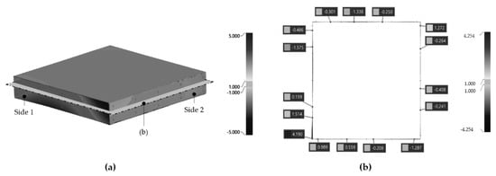 Next, as shown in Figure 16, the side error was analyzed. A total of 80 nodes were designated in four surfaces, 20 nodes side by side. The analyzed error had directionality. Based on the designed shape, the error had a vector value of (+ã) in the outside direction or a vector value of (−ã) in the inside direction. Therefore, the allowable error of side should be within ±3 mm in this study. The minimum value in Table 3 represents the maximum error in the direction inside the designed shape. The minimum error was measured to be −2.471, and the maximum error was measured to be 4.957 mm. The maximum error was out of the error range suggested in this study, which caused errors due to the failure to fully level the side mold control equipment during the experiment. However, side errors excluding this section were smaller than ±3 mm.