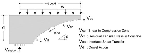 This research will be precisely on target if major parameters affecting shear strength of RC beam were identified and selected carefully. Some of the literature was quite helpful in identifying these parameters, as indicated by the joint ASCE-ACI Committee 426 [] and joint ASCE-ACI Committee 445 [], which is now generally accepted in the research community as a shear failure model (see Figure 1). Figure 1 shows that the shear strength of the concrete beam consists of a shear component in the compression zone of the beam that is not cracked (Vcc), shear transfer at the interface due to aggregate interlock (Vca), dowel action of longitudinal reinforcement (Vd), and the residual tensile stress across the crack (Vcr). Several parameters have been identified as having a significant influence on the contribution to the shear resistance mechanism. The most-dominant, known mechanism influences are concrete strength, span to depth ratio (a/d), longitudinal reinforcement ratio, aggregate size, axial force, as well as other parameters such as bearing conditions, point of loading, etc.