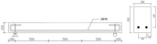 All of the beams had a width (b) of 100 mm, a total span length of 1700 mm and a total depth (h) of 150 mm. The distance between supports was 1500 mm. The ratio of shear span to effective depth (a/d) was 4.2. Two steel reinforcements with a diameter of 16 mm and yield strength of 402.95 MPa were used as longitudinal tensile reinforcement. The placement of the longitudinal reinforcement can be seen in Figure 2.