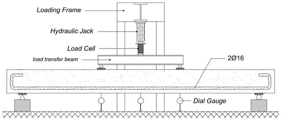 Loading on the beam was applied by a hydraulic pump connected to a load measuring instrument (load cell) and a digital load indicator. The deflection of the beam was measured by a dial gauge, placed as indicated in Figure 3.