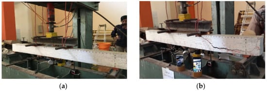 The beam was tested with a four-point bending configuration on a simple support, as shown in Figure 3. Steel profile I was used as a point load divider at both ends. At a load increment of 0.25 kN, cracks on both sides of the beam were observed visually and plotted on both sides of the beam. The condition of the beams before and after failure can be seen in Figure 4.