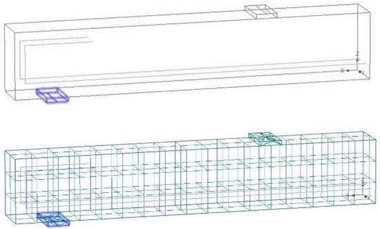 The meshing process of the beam into small finite elements was automatically carried out in the ATENA software. The basic elements that can be selected for meshing are brick, tetra and brick-tetra combinations. The tetra element has a higher order of analysis compared to brick. The consequence of choosing the finite element model is the computational complexity. Basically, a simpler model is preferable as long as the results obtained are sufficiently representative. Considering this, the brick element was chosen in this research. The results of the beam modeling are shown in Figure 6.