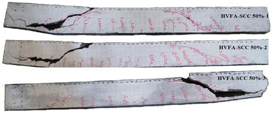 Crack pattern of 50% HVFA-SCC concrete at ultimate shear force.