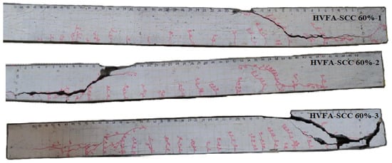 Crack pattern of 60% HVFA-SCC concrete at ultimate shear force.
